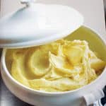 Tilsæt smørret og fortsæt med at mose, til det er blandet helt ind i kartoflerne. Tilsæt mælken.